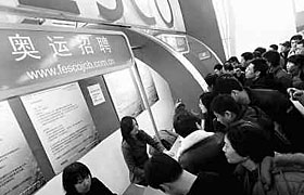 2月17日開幕的2008年北京春季招聘會(huì)首次設(shè)立了奧運(yùn)專場,部分奧運(yùn)供應(yīng)商、服務(wù)商現(xiàn)場攬才。其中,一家中介機(jī)構(gòu)為外資企業(yè)在奧運(yùn)期間招聘400名司機(jī),打出了最高8000元的月薪。吳長青/攝 |