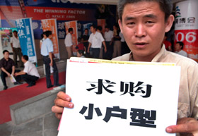 2006寧夏銀川房博會(huì)上出現(xiàn)大戶(hù)型高唱主調(diào),中低價(jià)位、中小戶(hù)型房源緊缺現(xiàn)象,房博會(huì)上出現(xiàn)購(gòu)房者一“小”難求的局面。圖為一名購(gòu)房者在房博會(huì)門(mén)口打出求購(gòu)小戶(hù)型的廣告。本報(bào)記者