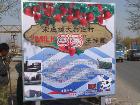 通州區(qū)移動(dòng)公司為大興莊樹的草莓采摘園廣告宣傳牌。這是村官孫璐珺與通州區(qū)移動(dòng)公司“談判”的成果。 3、