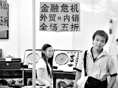 “外博會”上,一家參展商在展位前掛出“金融危機,外貿(mào)轉(zhuǎn)內(nèi)銷,全場五折”的字樣吸引采購商和觀眾。本報記者:陳曄華 攝 |