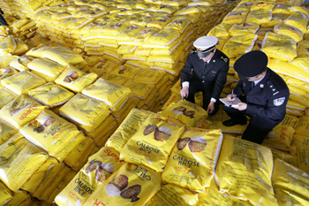 海關(guān)人員正在清點(diǎn)查獲的走私大米。蘇斌