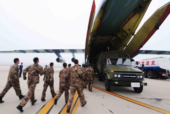 北京南苑機場,救援人員準(zhǔn)備登上大型運輸機。新華社發(fā)(沈玲 攝) |