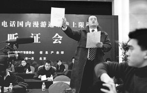 1月22日,“降低移動(dòng)電話國(guó)內(nèi)漫游通話費(fèi)上限標(biāo)準(zhǔn)聽證會(huì)”在北京舉行。在會(huì)后的新聞發(fā)布會(huì)上,因申請(qǐng)旁聽此次聽證會(huì)遭拒的法學(xué)碩士郝勁松突然跳上桌椅發(fā)問。本報(bào)記者