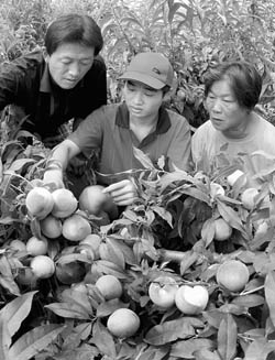 大學生志愿者高杰培在山西省夏縣瑤峰鎮(zhèn)大辛莊村向村民傳授桃樹的管理技術。薛俊