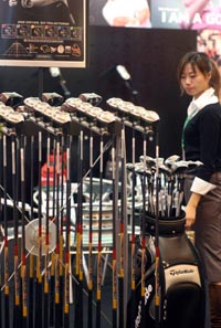 2006上海亞洲國際高爾夫博覽會11月13日在上海開幕,來自世界各地的高爾夫俱樂部、高爾夫球廠、球具制造商、服裝生產(chǎn)商等近百家廠商參展。圖為參展商在博覽會上展示高爾夫球具產(chǎn)品。