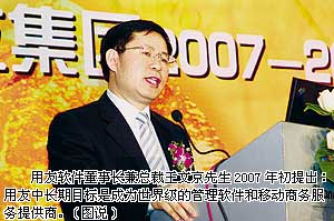 來自權(quán)威市場(chǎng)調(diào)研機(jī)構(gòu)數(shù)據(jù)顯示,用友軟件已連續(xù)五年超越國際廠商成為中國企業(yè)管理軟件/ERP市場(chǎng)的領(lǐng)導(dǎo)者,徹底改變了中國和亞太企業(yè)管理軟件/ERP市場(chǎng)的格局。2007年2月用友集團(tuán)發(fā)布新三年規(guī)劃,明確把“管理軟件”和“移動(dòng)商務(wù)”作為公司下一個(gè)發(fā)展階段的兩大核心業(yè)務(wù),并將成為“世界級(jí)的管理軟件和移動(dòng)商務(wù)服務(wù)提供商”作為公司中長期發(fā)展目標(biāo)。用友集團(tuán)計(jì)劃戰(zhàn)略加強(qiáng)管理軟件業(yè)務(wù)的發(fā)展,目標(biāo)是要成為亞洲最大,世界前五;計(jì)劃戰(zhàn)略培植移動(dòng)商務(wù)業(yè)務(wù),目標(biāo)是要成為中國最大,世界第一。這是一個(gè)宏偉的目標(biāo),市場(chǎng)再次將目光聚焦于用友身上。