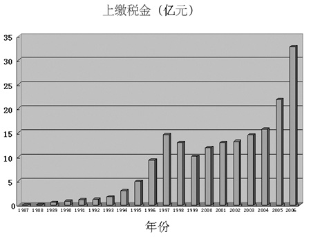 2006年,據(jù)不完全統(tǒng)計(jì),全國(guó)財(cái)務(wù)公司上繳稅金33億元,較1987年的50萬(wàn)元增長(zhǎng)了6600倍。(見(jiàn)圖四)