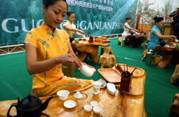 甘肅隴南油橄欖產(chǎn)品展示會日前在蘭州舉行。隴南市是全國油橄欖最佳適生區(qū),也是中國優(yōu)質(zhì)油橄欖的主產(chǎn)區(qū)。2006年12月,隴南油橄欖獲得了由國家質(zhì)檢總局頒發(fā)的“地理標(biāo)志產(chǎn)品保護”專用標(biāo)志。圖為幾名茶藝師正在進行油橄欖茶藝表演。