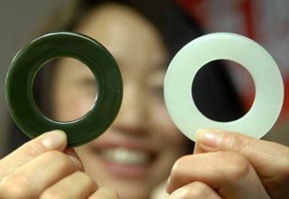 工作人員展示將作為2008年奧運會獎牌所用玉料的樣品(左為青玉、右為白玉)。本報資料照片 | 美玉收藏行情看漲