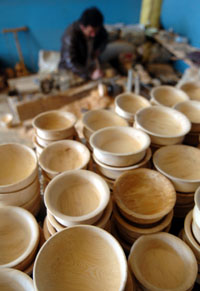 近年來,隨著大批游客的到來,云南省迪慶藏族自治州藏族獨(dú)具民族特色的民間手工藝品和藝術(shù)品頗受青睞。圖為一位工匠在香格里拉縣的藏族村莊中加工木碗。