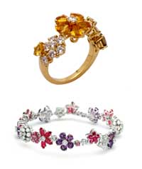 為了營(yíng)造別具特色的色調(diào)效果,工匠創(chuàng)造出了三種與鉆石相配合的和諧色:粉藍(lán)寶石配鉆石;粉紅色及淡紫色寶石配鉆石;橘黃色及綠色寶石配鉆石。柔和的淡粉紅色與更加鮮艷的深粉紅色形成對(duì)比,襯托出淡紫色寶石的美麗;黃色到綠色的漸變差異營(yíng)造出了看似單色的效果。這些具有細(xì)微差別的半寶石被挑選出來,在每件單品上變換不同色彩以重新塑造野花的和諧與雅致之美。 |
