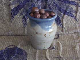 這樣的小罐子,用來插花,挺好,是那種開得密密的、小小的黃白花,放在窗臺上,白色的窗簾再一飄,哈,那是一個很美麗的意境呢;用來裝東西也不錯,我現(xiàn)在裝了一罐子揀來的野栗子,那顏色和這個罐子配起來還挺協(xié)調(diào)的呢。