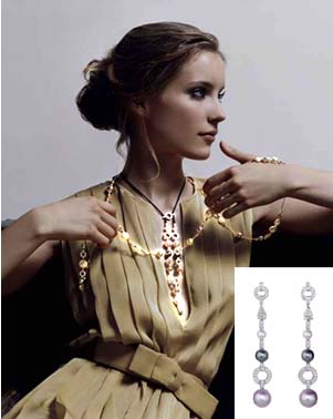 神秘醉人的塔希提島珍珠,風(fēng)格樸實的淡水珍珠,美麗動人的淺色和金色熱帶海洋珍珠交相輝映。珍珠有的相互連接,有的互相分離,均飾以精美鉆石,且配色巧妙:黑色與橙紅,巧克力與玫瑰紅搭配得天衣無縫,加之完美無缺的造型,串串珍珠瑰麗多彩,變幻無窮,盡顯純凈優(yōu)雅的風(fēng)格。