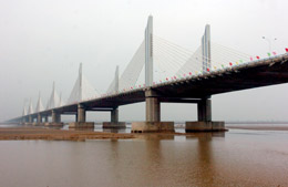 11月28日,大(慶)廣(州)高速公路河南段標(biāo)志性建筑——開(kāi)封黃河大橋建成通車。 開(kāi)封黃河大橋于2004年9月開(kāi)工建設(shè),總投資約20億元,全長(zhǎng)7.8公里,主橋長(zhǎng)1010米,橋?qū)?7.4米。圖為建成通車的開(kāi)封黃河大橋。
