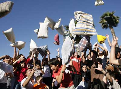 這場枕頭“大戰(zhàn)”的“戰(zhàn)書”是由大學(xué)生事先在網(wǎng)絡(luò)和當(dāng)?shù)貓蠹埳习l(fā)布的。