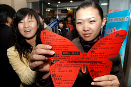 近來,在銀川市部分招聘洽談會上,一種制作成蝴蝶形狀的招聘廣告單十分引人注目,據(jù)說在職場中“紅蝴蝶”能給求職者帶來好運。圖為招聘洽談會上一名女孩正在展示“紅蝴蝶”招聘廣告單。