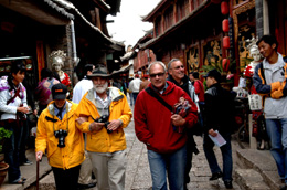 中外游客在云南省麗江市古城四方街參觀有800多年歷史的納西族古老宅居。本報記者:周重要