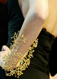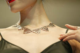 圖片說明:上海國際首飾時(shí)尚節(jié)上展出的珠寶首飾。依次為:蛇形鉑金手鐲、銀質(zhì)項(xiàng)鏈、金制工藝手鐲和工藝項(xiàng)鏈。(本報(bào)資料照片) |