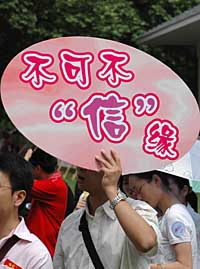 以“‘潤物(武)細(xì)無聲,真愛‘大’無言”為標(biāo)語的武漢大學(xué)相親團(tuán)人氣極旺,參會(huì)的年輕老師說:“相親的人太多了,職業(yè)明晰、個(gè)性十足的愛情宣言才能贏得更多的機(jī)會(huì)。”