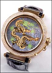 相比之下,卡地亞與中國的情緣可以追溯到19世紀(jì),在卡地亞的系列作品中經(jīng)常能看到中國元素。此次鐘表展上的琺瑯系列試圖以祥云吐霧、天馬踏云的圖案來彰顯佩戴者的王者霸氣,不僅在工藝上做到了精美玲瓏、典雅高貴,且將中國藝術(shù)與琺瑯?biāo)囆g(shù)巧妙搭配,相得益彰。 |