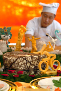 承擔(dān)北京2008年奧運(yùn)會(huì)接待任務(wù)的北京老字號(hào)名店“全聚德”日前在其舉行的“奧運(yùn)服務(wù)知識(shí)與技能競(jìng)賽”活動(dòng)中,推出創(chuàng)新面點(diǎn)和冷葷菜點(diǎn),并展示了將在奧運(yùn)期間提供給中外賓客的部分冷葷拼盤(pán)和面點(diǎn)樣本。圖為一名廚師在觀看用奶油蛋糕制成的奧運(yùn)場(chǎng)館“鳥(niǎo)巢”模型。 |