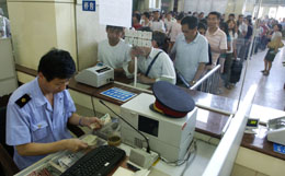 2007年鐵路暑運(yùn)從7月1日起至8月31日止,共計(jì)62天。按照已出臺(tái)的鐵路暑運(yùn)方案,全國(guó)鐵路預(yù)計(jì)發(fā)送旅客2.46億人次,同比增加1407萬人次。太原鐵路局計(jì)劃增加4對(duì)跨局臨客、1對(duì)管內(nèi)臨客和3對(duì)客車延長(zhǎng)線路,預(yù)計(jì)暑運(yùn)期間發(fā)送旅客近700萬人次。圖為7月1日,在太原火車站售票廳,旅客在排隊(duì)購(gòu)票。 |
