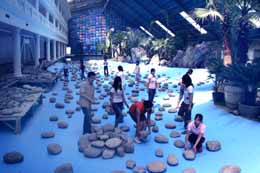 由中外合資投建的北京蟹島趕海宮7月1日建成,只等灌入海水。蟹島趕海宮建筑面積20000平方米,將引進(jìn)純海水4000立方,純海沙1000立方,利用太陽能打造綠色環(huán)保建筑,實行高科技全自動化水循環(huán)凈化系統(tǒng)。為喜愛海水的游人提供旅游休閑的一處勝地。圖為工作人員在北京蟹島趕海宮布置“海底”。