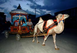 游人坐著駱駝車在呼倫貝爾市的海拉爾街頭游覽。本報(bào)記者:任軍川 攝