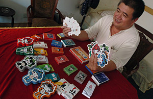 “這些撲克都是我從牙縫里省出來的,心愛得就像自己的孩子”趙玉學(xué)說。 1987年,趙玉學(xué)剛到陽泉鋁業(yè)公司上班,跑采購的他“幾乎天天出差”。在外地忙完工作,趙玉學(xué)經(jīng)常買副撲克作為紀(jì)念,他說是因?yàn)椤百I不起別的紀(jì)念品”。隨著撲克增多,上世紀(jì)90年代初,趙玉學(xué)開始專業(yè)收藏?fù)淇恕?BR> 在趙玉學(xué)的藏品中,有十余個(gè)國家的外國撲克。1990年,趙玉學(xué)去連云港出差,在一家大超市看到一副日本著名的“浮士繪”撲克。這種反映日本民間藝術(shù)的撲克紙質(zhì)極好,手感光滑如綿,繪圖印刷精美,但一副23元。這樣的價(jià)位,令趙玉學(xué)在這家超市幾進(jìn)幾出。最后,愛牌心切的他還是咬牙買了。現(xiàn)在,趙玉學(xué)已經(jīng)收集了五套不同的“浮士繪”撲克。目前,這種國內(nèi)很少見的撲克每套售價(jià)在百元以上。 為了收藏?fù)淇耍兄?5年煙齡、一天抽三包煙的老煙民趙玉學(xué)戒了煙。1992年,為了收集毛主席像剪紙撲克,他一下花掉三個(gè)月的工資。 趙玉學(xué)的親朋好友知道他有這個(gè)愛好,只要出差,總會(huì)給他帶回一些外地?fù)淇。趙玉學(xué)的不少外國撲克,就是靠這種方法收藏到的。