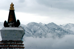 青海湖畔的佛塔與“雪山云海”奇觀相映成趣。 本報記者:侯德強 攝 |