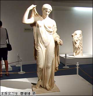 初秋的北京,午后的陽光依然灼熱,長安街一如往常的車水馬龍,在繁華喧囂的街市旁卻有一處能夠讓心靈沉靜下來的空間。首都博物館外,印有巨幅維納斯雕像的海報吸引著人們走入古典希臘藝術(shù)的殿堂,主題為“古典希臘藝術(shù)”的盧浮宮珍藏展正在這里舉行。 步入首都博物館1400平方米的臨時展廳,四根形似帕特農(nóng)神廟的石柱高高矗立在記者面前,在燈光照射下,帶有黃土一般色彩的柱子散發(fā)著神秘氣息,好似一道穿越時光的大門,邀請人們踏上一場古希臘文化之旅。