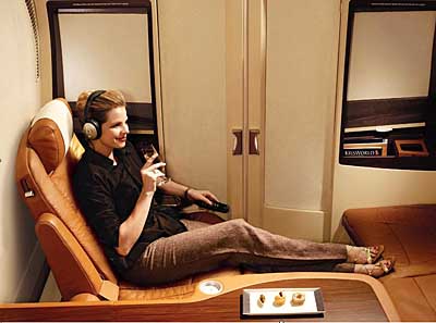 在新加坡航空接收的全球第一架A380客機(jī)上,增設(shè)了全新的豪華套艙。 新航豪華套艙設(shè)有舒適豪華的皮革座椅,每個(gè)座位上都配有一個(gè)世界著名品牌Poltrona