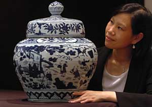 明嘉靖青花《庭院嬰戲圖》蓋罐,拍品估價(jià)為3000萬港元。新華社記者 黃本強(qiáng)