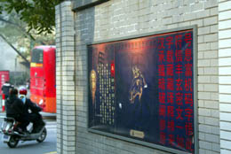 陜西省西安市為進(jìn)一步提升歷史文化品位,弘揚(yáng)中華文化,將西大街規(guī)劃建設(shè)為仿古建筑一條街,與鐘樓、鼓樓和城墻等相呼應(yīng),再現(xiàn)盛唐時(shí)期文化的獨(dú)特魅力。在大力發(fā)展經(jīng)濟(jì)、努力建設(shè)國際化大都市的同時(shí),西安市積極推動社會主義文化建設(shè),以提高居民的文明素質(zhì),建設(shè)文化小康、精神小康。 西安市街道上的文化海報(bào)。 |