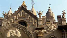 武漢古德寺,是國(guó)內(nèi)漢傳佛教中惟一一座仿緬式佛教寺院,始建于清光緒三年(1887年)。寺院迥異于中國(guó)傳統(tǒng)佛教寺廟樣式,仿緬甸阿難陀寺院風(fēng)格,分別借鑒了南傳佛教“帕那瓦”式的群塔叢林和古希臘神廟的柱廊特征,并融入了哥特式建筑風(fēng)格。這座融匯大乘、小乘和藏密三大佛教流派于一身,并具有多元化建筑風(fēng)格的寺廟,是武漢百年前即向世界開放的有力證據(jù),具有非常獨(dú)特的建筑觀賞價(jià)值、旅游價(jià)值與文物保護(hù)價(jià)值。圖為古德寺圓通寶殿頂部的造像和圖案,具有鮮明的異域佛教寺院風(fēng)格。 |