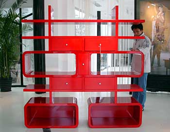 蘇州市山塘街一家具店內(nèi)展示的富有創(chuàng)意的家具十分引人注目。這些家具將實用性與藝術(shù)性巧妙地融為一體,構(gòu)思奇特。圖為一名顧客欣賞“紅雙喜”字造型的家具。