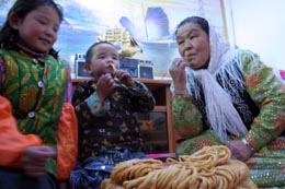 12月2日,甘肅省酒泉市阿克塞哈薩克族自治縣牧民庫(kù)麗達(dá)熱(右)在定居房?jī)?nèi)和孫子們一起品嘗哈薩克民族食品。 甘肅省酒泉市阿克塞哈薩克族自治縣結(jié)合縣城搬遷工程,以牧民定居和高標(biāo)準(zhǔn)小康建設(shè)為目標(biāo),堅(jiān)持高起點(diǎn)、高標(biāo)準(zhǔn)、超前意識(shí)的原則,統(tǒng)一規(guī)劃,牧民投資,縣、鄉(xiāng)政府補(bǔ)助修建民族新村定居點(diǎn),實(shí)現(xiàn)了水、路、電、閉路電視、電話(huà)和天然氣“六通”,F(xiàn)入住牧民494戶(hù)1967人,占全縣牧民人口的85%。民族新村的建設(shè)改變了以往牧民逐水草而居的游牧生活,提高了生活水平,牧民群眾真正實(shí)現(xiàn)了從游牧到定居,從溫飽到小康的歷史性變化,正在向全面的、更高層次的小康目標(biāo)邁進(jìn)。 |