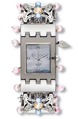 Swatch的這款令人炫目的方形淑女腕表配有別致的表鏈,中間一列鏈節(jié)為精鋼海星造型。每一顆海星的中央都鑲嵌有一粒淺粉色珍珠,并綴有白色與彩色珍珠掛墜和一片小小的鋼葉。本報(bào)資料照片