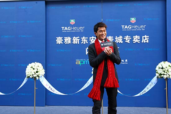 S計(jì)時(shí)碼表“中國之隊(duì)”限量版腕表。該款腕表不僅擁有卓越性能,更在鋁制表圈裝飾有紅黃兩種中國之隊(duì)的專有顏色。 圖為影視紅星古天樂在豪雅表專賣店開業(yè)儀式上助興。本報(bào)資料照片 | |