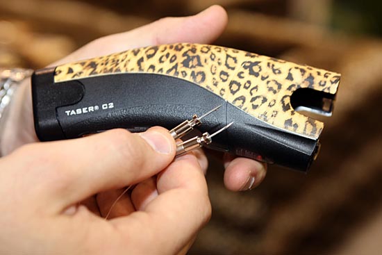 在剛剛結(jié)束的國(guó)際消費(fèi)電子展上亮相的一款時(shí)尚防身槍——新款泰瑟槍,或許能夠滿足時(shí)尚女性的需求。 這款泰瑟槍的首要功能是防衛(wèi),能發(fā)射5萬(wàn)伏特的高壓電脈沖。被擊中者神經(jīng)和肌肉系統(tǒng)暫時(shí)癱瘓,失去行動(dòng)能力。其不凡之處在于它內(nèi)置有一臺(tái)mp3音樂(lè)播放器,存儲(chǔ)器容量1G。新華社/法新 | |