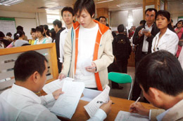 日前,海南2008年第一屆人才勞動(dòng)力招聘會(huì)在位于海口市的海南省人才勞動(dòng)力市場舉行,求職人員免費(fèi)入場。當(dāng)日,共有近百家單位現(xiàn)場進(jìn)行招聘,提供大量服務(wù)員、營業(yè)員、收銀員等春節(jié)前較缺人手的服務(wù)性崗位。