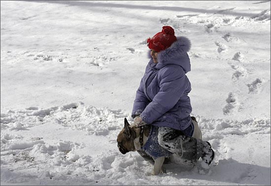 在烏克蘭首都基輔,一個(gè)小女孩騎著她的寵物狗在白雪覆蓋的公園里盡情玩耍。新華社/路透