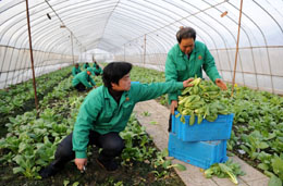 在冰雪災害期間,寧波鎮(zhèn)海蔬菜基地的近200座蔬菜大棚有1/3受損。目前,該基地正在積極進行災后重建、恢復生產(chǎn)工作,遭到破壞的大棚已基本修繕完畢,每日自產(chǎn)瓜果、蔬菜3至5噸供應寧波市場,為當?shù)鼐用竦恼I钐峁┝擞辛ΡU。圖為菜農(nóng)在蔬菜基地大棚內采摘蔬菜。