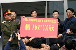 20日,解放軍總裝備部政治部副主任郝建昌少將把1000萬元捐款交至四川省副省長(zhǎng)張作哈手中。