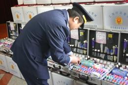 8日,記者從黑龍江工商系統(tǒng)食品安全快速檢測(cè)箱啟動(dòng)儀式上獲悉,為了確保百姓吃上放心食品,讓假冒偽劣和違規(guī)食品添加劑無處遁形,黑龍江投入大量資金為基層工商所配備食品安全快速檢測(cè)箱。該設(shè)備的投入使用,將有效防止假冒偽劣食品流入市場(chǎng),為百姓營造安全放心的食品消費(fèi)環(huán)境。圖為黑龍江一位基層工商所的工作人員在查看快速檢測(cè)箱的化學(xué)試劑。 |