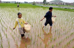 5月7日,江西于都縣車(chē)溪鄉(xiāng)車(chē)勝村農(nóng)民正在給早稻追肥。 今年來(lái),江西各地把省里的各項(xiàng)支農(nóng)、強(qiáng)農(nóng)政策落實(shí),有效地保護(hù)了農(nóng)民種糧積極性。今年,江西全省糧食面積穩(wěn)定在5400萬(wàn)畝,預(yù)計(jì)糧食總產(chǎn)量達(dá)到190億公斤以上,確保江西糧食主產(chǎn)區(qū)地位不動(dòng)搖,確保對(duì)國(guó)家糧食安全的貢獻(xiàn)不降低。 |