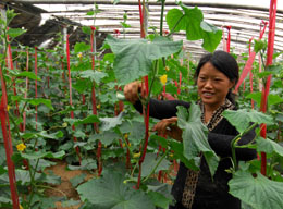 江西樂(lè)平市鎮(zhèn)橋鎮(zhèn)百樂(lè)村菜農(nóng)王淑琴喜看長(zhǎng)勢(shì)良好的小黃瓜。 近年來(lái),江西省樂(lè)平市鎮(zhèn)橋鎮(zhèn)在冬暖式大棚蔬菜生產(chǎn)的基礎(chǔ)上,擴(kuò)大產(chǎn)銷規(guī)模,2007年該鎮(zhèn)與臺(tái)灣吳太港發(fā)展促進(jìn)會(huì)宏茂果蔬食品加工廠聯(lián)姻發(fā)展小黃瓜、缸豆等“訂單蔬菜”生產(chǎn),種一畝黃瓜為菜農(nóng)提供預(yù)付定金、支架、種子、肥料等款計(jì)400元左右。菜農(nóng)種植的“訂單蔬菜”將通過(guò)當(dāng)?shù)爻闪⒌内M臺(tái)蔬菜加工廠加工后銷往臺(tái)灣和東南亞地區(qū)。 |