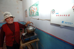 近年來,位于青海省柴達木盆地的海西蒙古族藏族自治州農(nóng)業(yè)部門在戈壁農(nóng)村庭院內(nèi)積極推廣修建日光溫室、豬禽舍、廁所、沼氣池,發(fā)展“四位一體”相結(jié)合的新能源生態(tài)庭院,并根據(jù)有關(guān)規(guī)定按照各地實際情況免費發(fā)放沼氣設(shè)施配套設(shè)備,讓農(nóng)民告別了煙熏火燎的日子。圖為都蘭縣興盛村一位農(nóng)民在利用沼氣燒水。