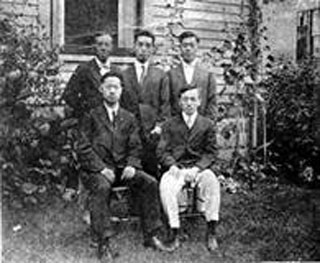中國科學(xué)社第一屆董事會主要成員合影(民國四年十月二十五日),后排左起為秉志、任鴻雋、胡明復(fù),前排左起趙云任、周仁。 |