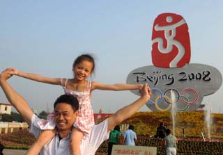 從深圳來(lái)北京旅游的劉怡靜(上)和爸爸在天安門(mén)廣場(chǎng)“舞動(dòng)的北京”花壇前留影。本報(bào)記者:羅曉光 攝